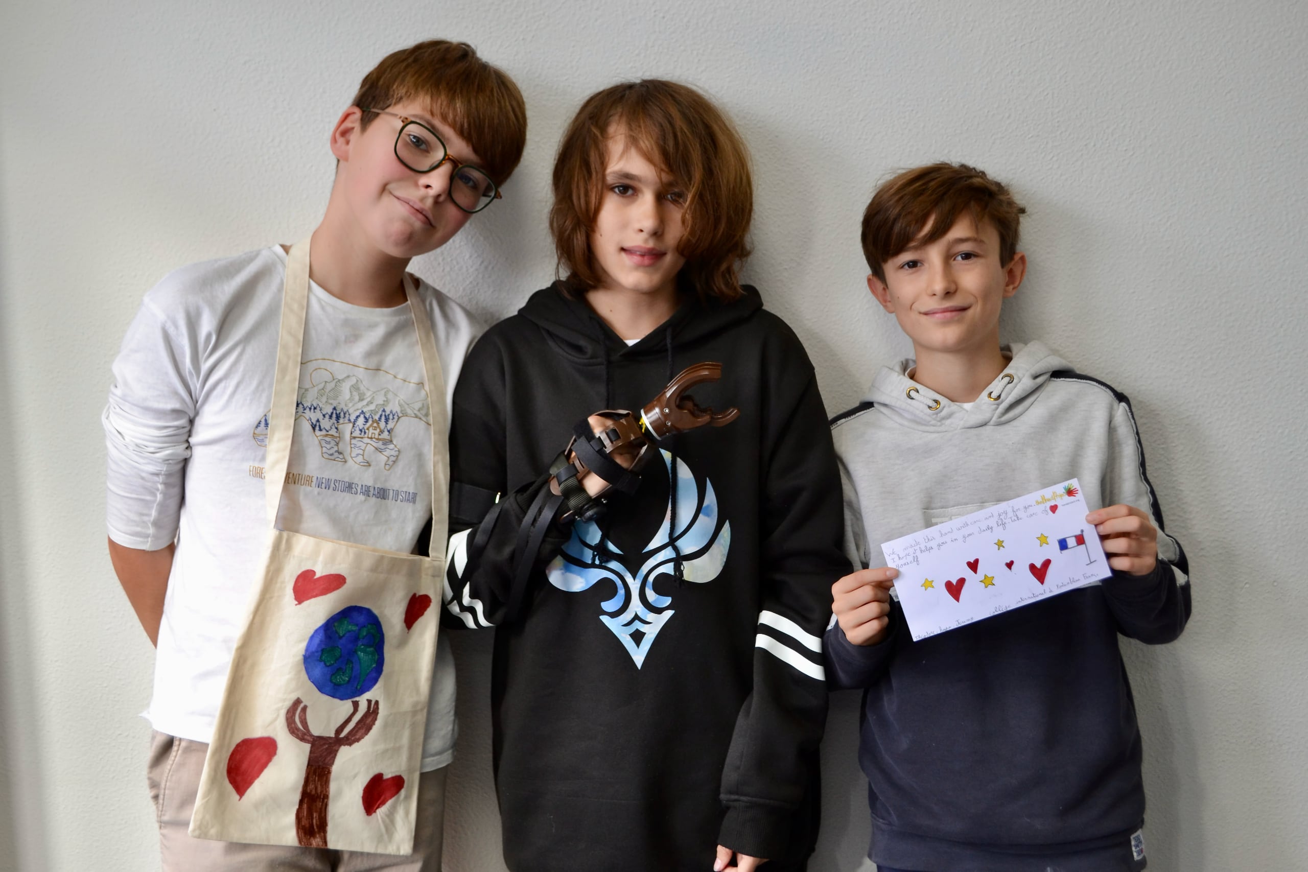 Clémence Bruant : Au départ, on nous donne un pochon avec un mode d’emploi, les pièces à monter, et quelques outils. Grâce au mode d’emploi, nous avons pu monter notre prothèses. Nous avons laissé une petite lettre en anglais pour le nouveau propriétaire et un sac pour ranger et transporter la main. Sur le sac, il y a un petit dessin que nous avons dessiné. Il y a aussi une photo des personnes qui ont créé la main mécanique. Maintenant, quelqu’un qui a été amputé ou qui est né sans main ou sans bras pourra désormais dessiner, écrire, attraper des objets, et encore plus ! Cela change leur vie. Merci l’équipe !